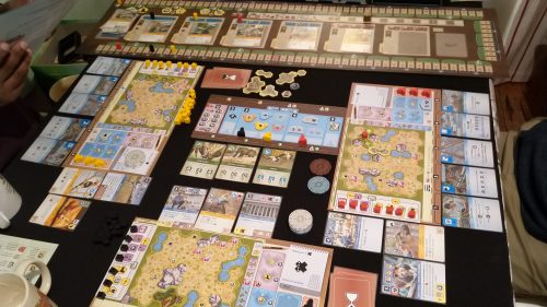 The game was designed in 1999, but a deluxe re-release brought this to our group. Unlike Ark Nova, it soon became a hit with everyone, despite the fact that few of us really like auction games. (For the record, I’m a big fan.) Ra shares a lot of the benefits of C:DMD: easy setup and tear down, easy teach, and a manageable complexity. It also plays in a very reasonable amount of time (around 2 hours). This brings us to another characteristic of highly replayable games: actual playing time.